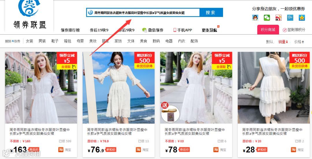 如果你们是先在淘宝/天猫上逛的,选好了商品,想找对应的优惠券的话,比如你在淘宝上看好了这条裙子,想找优惠券