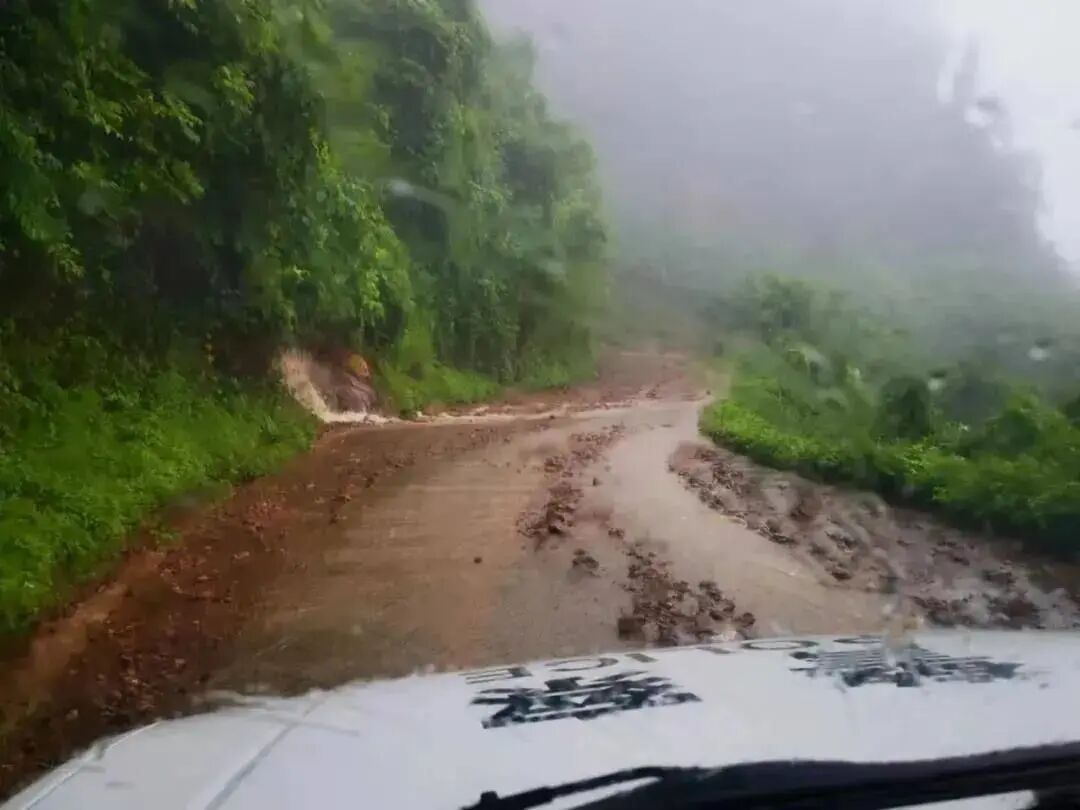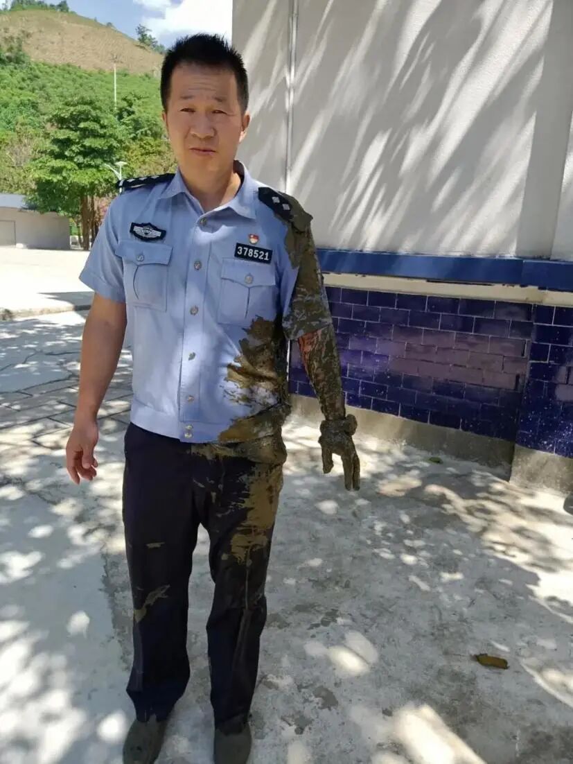 金水河边境派出所民警蔺发宝、辅警普建华开车巡逻时路遇泥石流