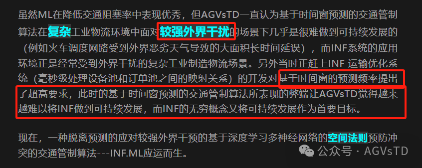 之所以对预测式技术路线比较了解的原因是INF系统的前身就是基于时间窗预测式的(注意,现在迪沃泰克将其(时间窗预测)标记为过时的技术,不再提供搭载该技术的产品。注意,这里并没有表示其他预测式技术也是过时的意思)。AGVsTD曾经的这部分成员现在为众多世界先进的无人驾驶技术公司做出贡献,所以我们深知在随着智能体数量上涨时预测式算法带来的弊端,这还是在不考虑整体运输优化系统的优化频率的前提下,如果考虑运输优化频率,问题就更大了。