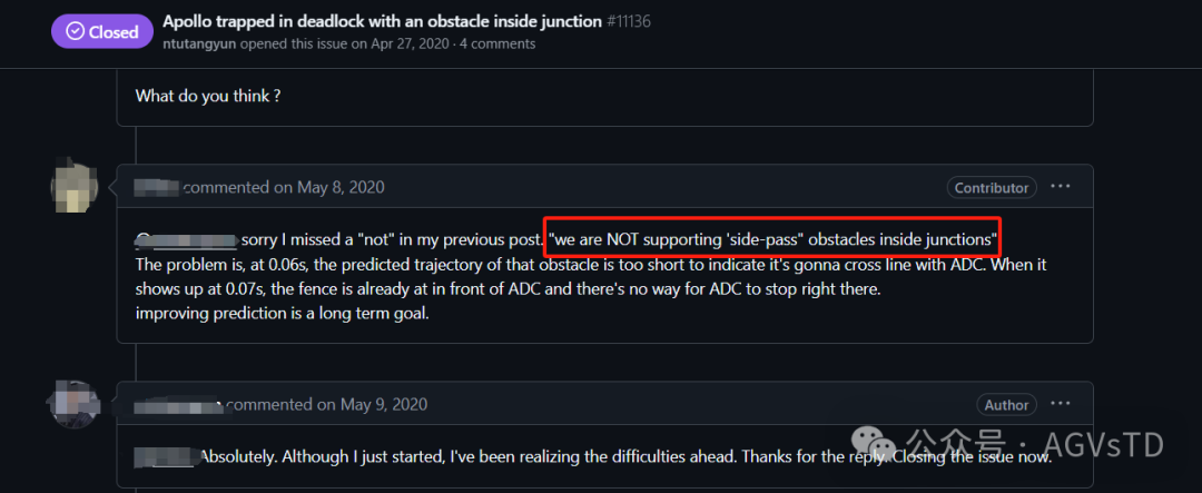 该Issue明确表示Apollo (当时的版本)不(NOT)支持在路口进行侧面(对向车道)通过(过来)的“Obstades(障碍物)”监测,注意是障碍物而没有指明这个障碍物是Apollo,当然后面我们可以知道这个“障碍物”应该是包括了Apollo在内的,但是问题也就出现在这里。