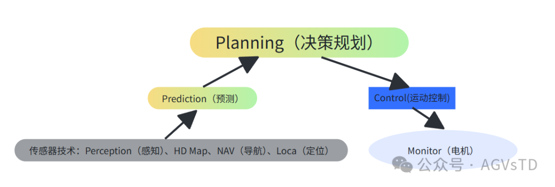 简单来讲,就是通过对周围环境的感知来进行车体控制的。Perception(感知)类似人的眼睛,Control(控制)类似人的手,而Planning(规划)充当了人的大脑,大脑将眼睛看到的信息进行分析和处理,然后通过手来控制方向盘。这也是为什么AGV行业中经常说“调度系统”是AGV集群的大脑。