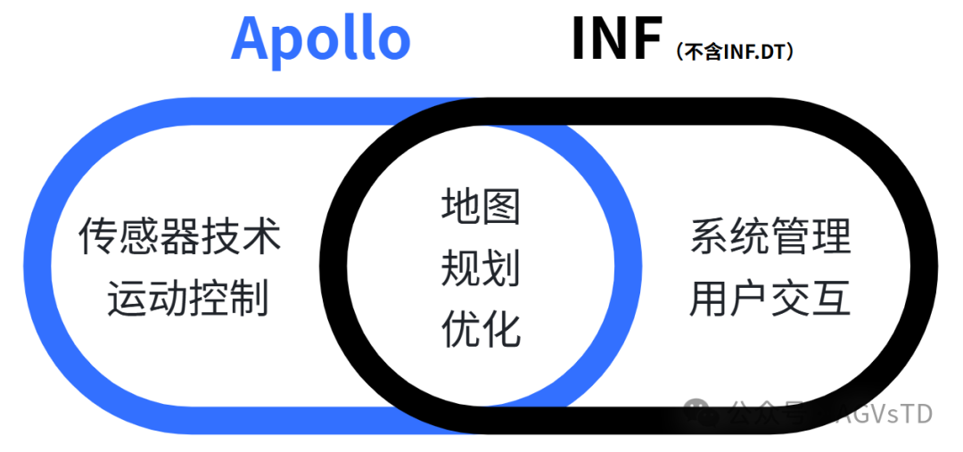 Apollo使用传感器技术帮助用户实现从有人驾驶汽车到无人驾驶汽车的转换。INF(不含INF.DT)主要侧重控制无人车集群之间的交通管制和用户体验。其中地图、规划和优化三个部分为两者共同涉及的技术,但均有不同意义。INF.DT是迪沃泰克机器人的数字孪生技术,从某种程度来讲,包括传感器和运动控制技术。