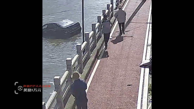就在13时59分,一辆黑色轿车途经此处,正转向附近停车位准备停车时,突然车子加速冲上游步道,撞开栏杆直接坠入河中。