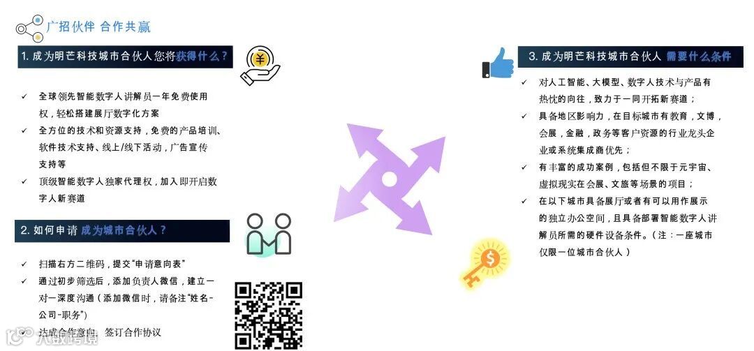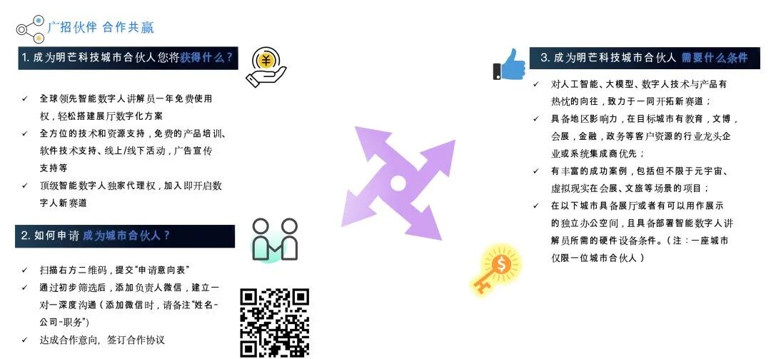 在目标城市具备展厅或者有可以用作展示的独立办公空间且具备部署智能数字人讲解员所需的硬件设备条件。(注:一座城市仅限一位城市合伙人)