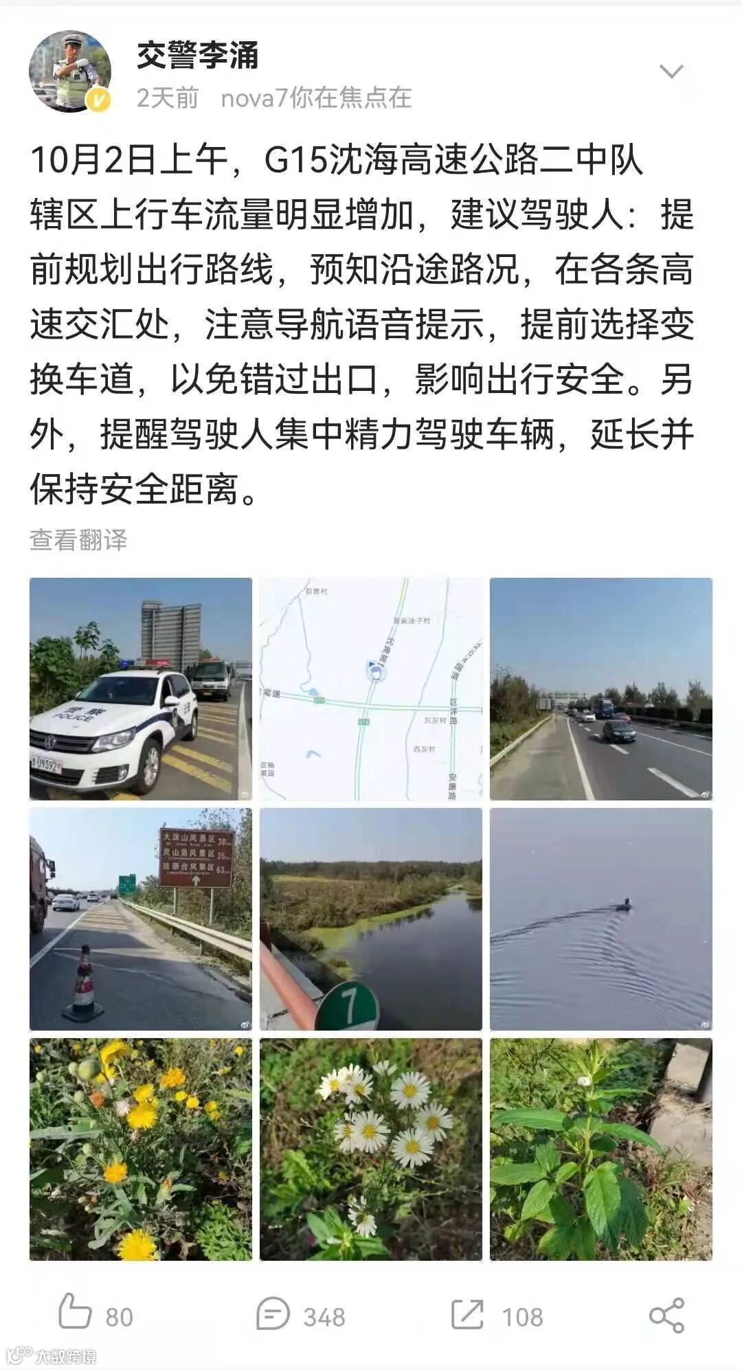 虽然执勤比较辛苦,但李涌苦中作乐,他热爱工作的同时更热爱生活。在10月2日的微博配图中,他还在工作之余拍下了黄色和白色的靓丽小花,秋日的平静湖面上,一只野鸭在自由潜行,泛起了片片涟漪。