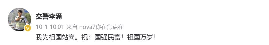“我为祖国站岗。祝:国强民富!祖国万岁!”10月1日上午10时01分,李涌在微博上发布动态,配图是他在王台收费站前标准的敬礼照片。