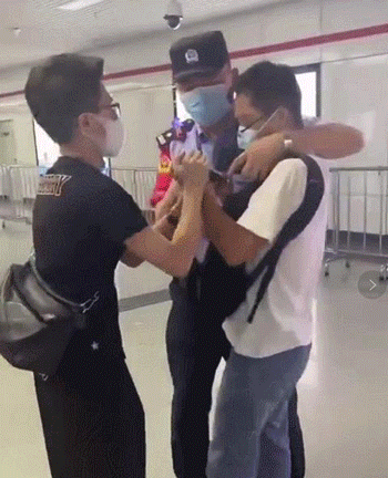 远处民警注意到了这一幕,黑衣男子又喊了一声,民警立即上前;