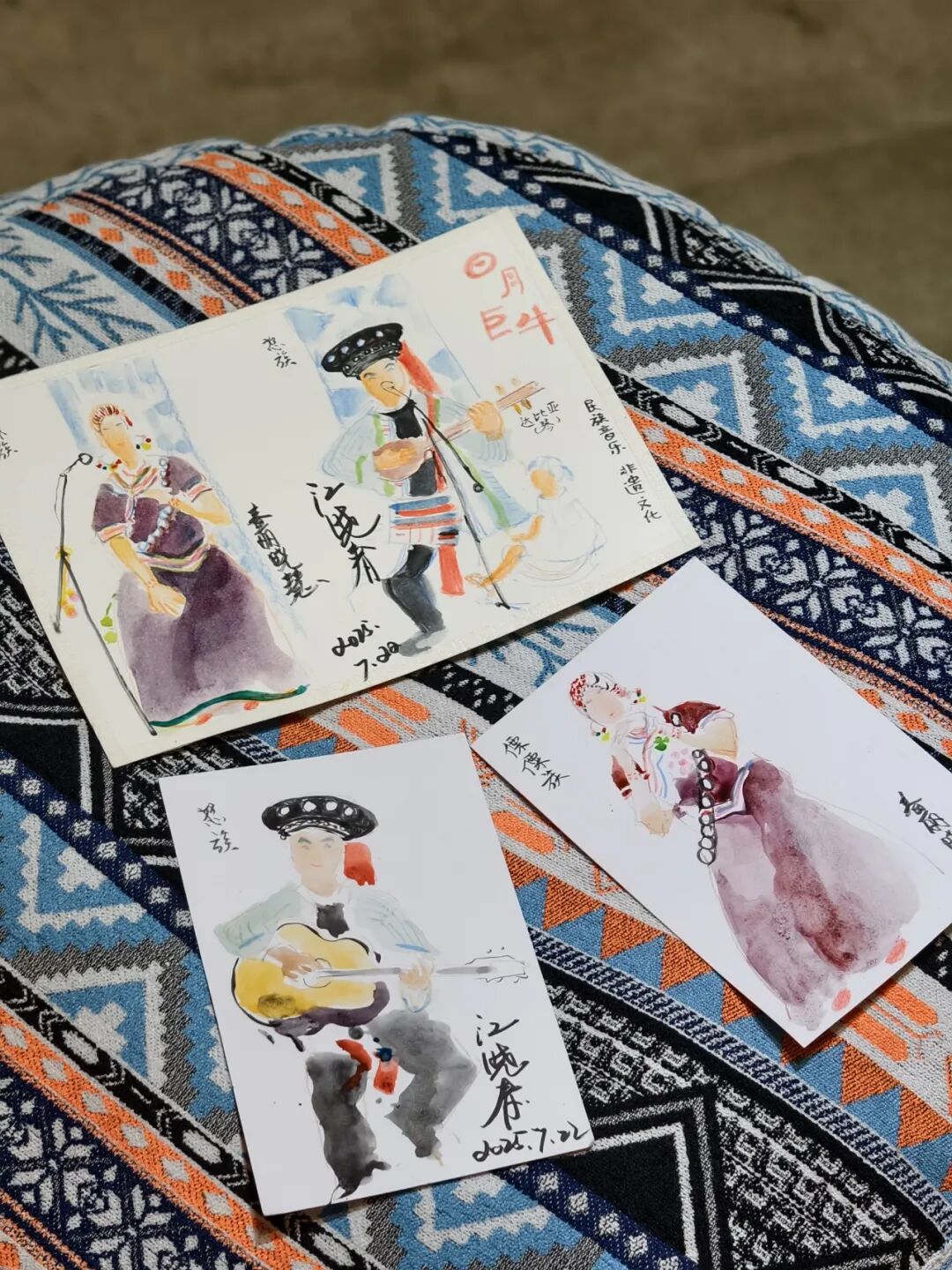 可能会撞见穿蓝布衫的姐姐,正对着展品画即兴水彩,画里的怒江音乐家形象充满了对艺术的热爱,姐姐的手随着音乐家歌声节奏,完全忘记了时间,当音乐家的歌声戛然而止的时候,姐姐的画作也跃然纸上。