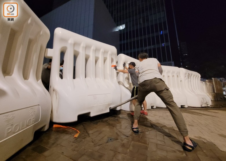 而特区政府总部和立法会一带作好相关移除安排后,也于2日晚10时许正式开工,工人合力撬动水马,现场将里边灌入的水放走。处理好的水马被逐一搬上货车运走。