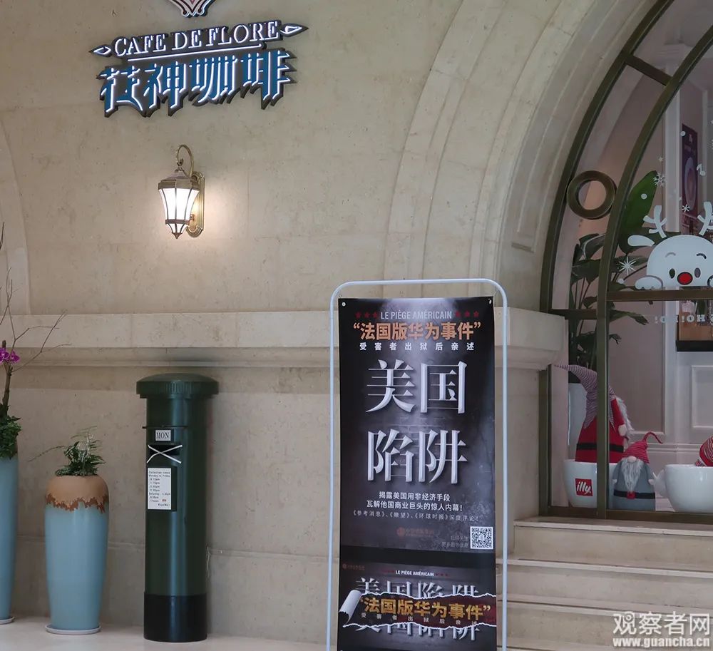 而在华为松山湖溪流背坡村多处咖啡厅的书架上,也出现了《美国陷阱》的身影。该书宣传易拉宝上还标注着“法国版华为事件”、“受害者出狱后亲述”以及“揭露美国用非经济手段瓦解他国商业巨头的惊人内幕”等字样。