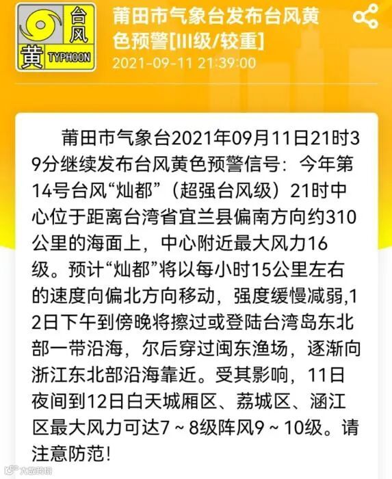 莆田市气象台11日21时39分继续发布台风黄色预警信号,“灿都”(超强台风级)预计将以每小时15公里左右的速度向偏北方向移动。受其影响,11日夜间到12日白天城厢区、荔城区、涵江区最大风力可达7到8级、阵风9到10级。