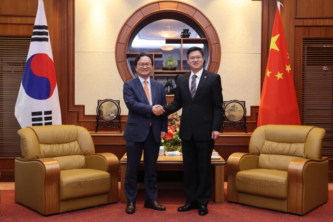 陈日彪祝贺丁大使履新,表示中韩是搬不走的近邻和分不开的伙伴,交流历史源远流长,合作成果令人瞩目。中国已完成脱贫攻坚、全面建成小康社会的历史任务,实现第一个百年奋斗目标,目前全国各族人民为全面建成社会主义现代化强国、实现第二个百年奋斗目标,以中国式现代化全面推进中华民族伟大复兴而奋斗。今年上半年,中国国内生产总值同比增长5.5%,相信中国新发展将为包括大邱市在内的韩国各地带来发展新机遇。中国坚定奉行亲诚惠容周边外交理念,高度重视发展与韩国的友好关系。大邱市是韩国传统工业城市,与中国多地交流合作密切,欢迎大邱市继续扩大对华地方交流、经贸合作,实现合作共赢。