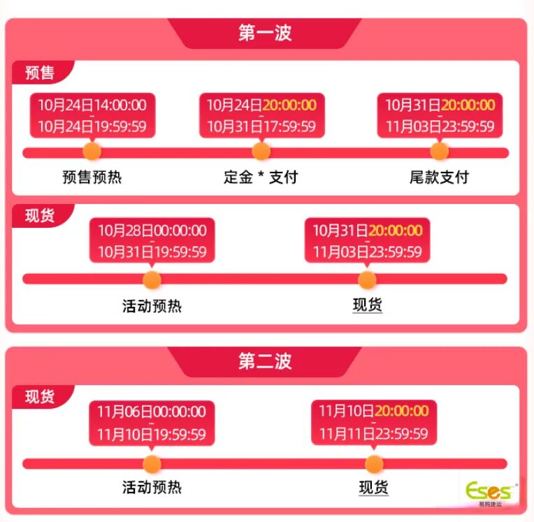 今年天猫双11活动整体分为两波,第一波为“天猫双11抢先购”,第二波为“天猫双11狂欢日”