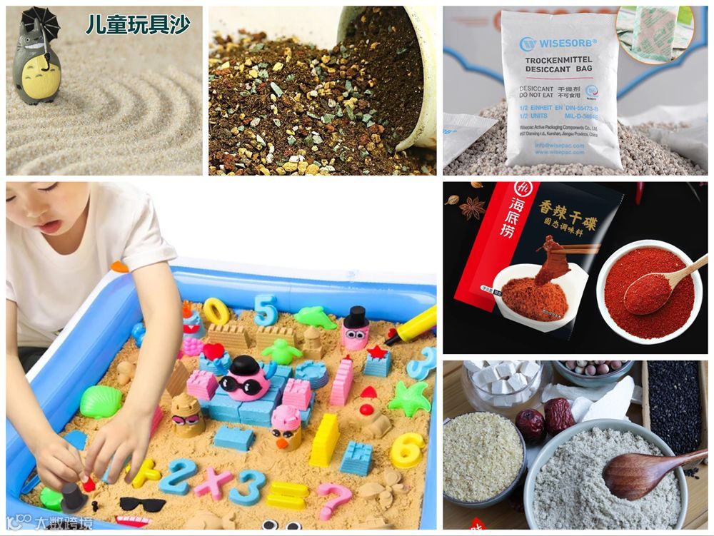 常见商品:五谷杂粮粉、五香粉、辣椒粉、生姜粉、芝麻糊、干燥剂、泥土、沙子、洗衣粉、麦片、橡皮泥等