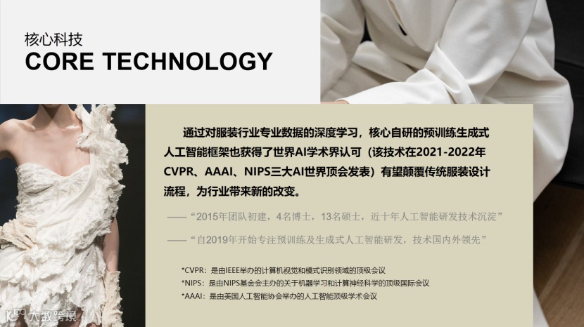 通过对服装行业专业数据的深度学习,核心自研的预训练生成式人工智能框架也获得了世界AI学术界认可(该技术在2021-2022年CVPR、AAAI、NIPS三大AI世界顶会发表)