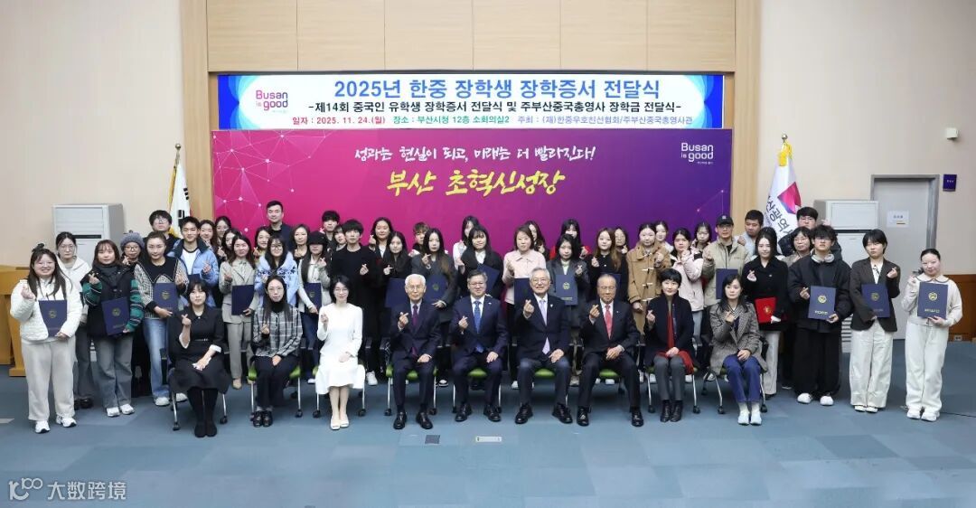 11月24日,驻釜山总领馆与韩中友好亲善协会共同举办中韩大学生奖学金颁发仪式。陈日彪总领事、釜山市长朴亨埈、韩中友好亲善协会会长申正泽、名誉会长徐义泽等及中韩获奖学生60余人出席。
