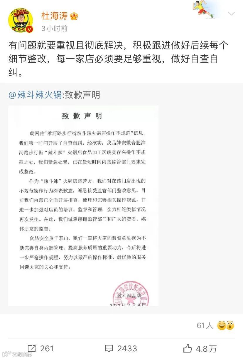 “辣斗辣”发布的《致歉声明》称,就网传“淮河路步行街辣斗辣火锅店操作不规范”信息,“辣斗辣”第一时间开展了自查自纠。经核实,安徽合肥淮河路步行街“辣斗辣”火锅店食品加工区确实存在操作不规范之处,公司紧急处置,已在最短时间内按监管部门要求完成整改。