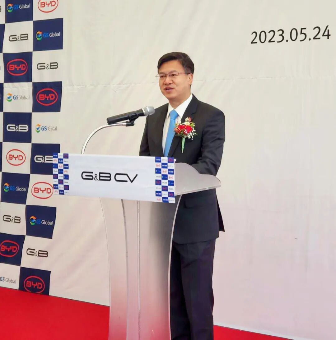 5月24日,陈日彪总领事出席比亚迪1吨纯电卡车进驻韩国东南地区市场庆祝仪式并致贺辞。