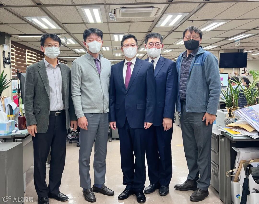 陈总领事与《国际新闻》政论室长郑相道、经营本部长李承烈、编辑局长李路星等