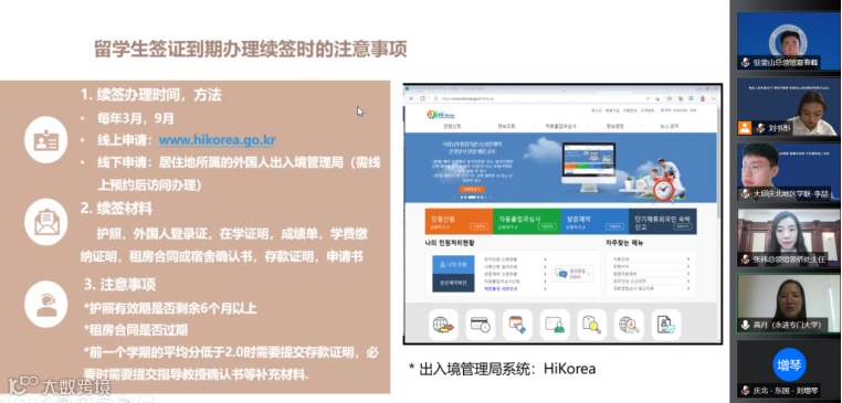 9月23日,驻釜山总领馆与大邱庆北和釜山庆南学联、韩国警方、高校面向领区各地高校留学生共同举办“领事开讲啦”平安留学线上讲座,针对安全、守法、在韩合法居留和服务管理等方面进行讲解宣介。