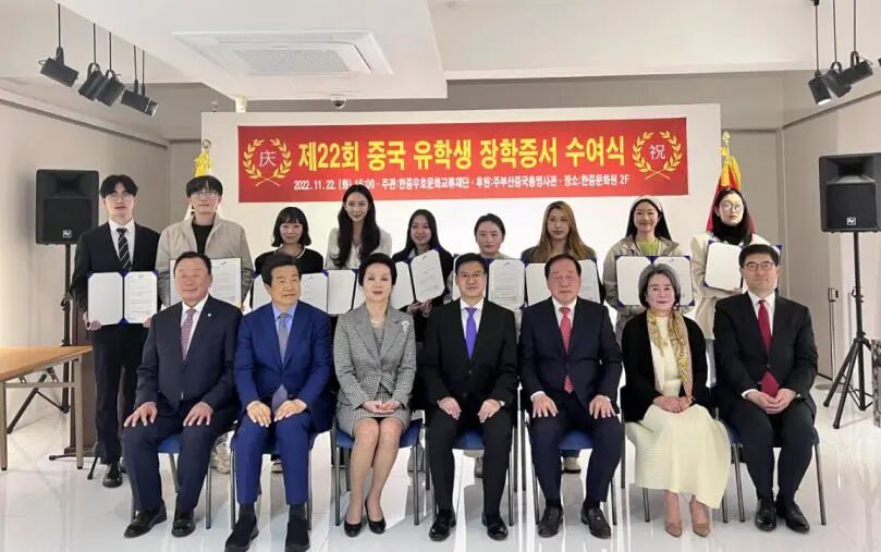 11月22日,驻釜山总领事陈日彪出席第二十二届韩中友好文化交流财团中国留学生奖学金颁发仪式并致辞、颁奖。韩中友好文化交流财团理事长李施英、韩国鞋类产业协会会长文昌燮、釜山风险投资协会会长金敬祚及我馆王从容参赞等出席。