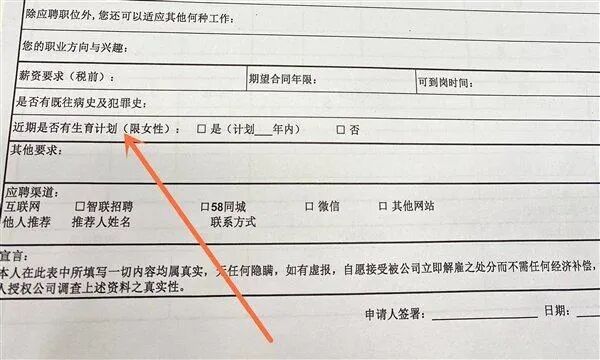 网友提供的照片显示,面试单上有一项为:近期是否有生育计划(限女性),是的话还要求填写计划时间(计划_年内)。