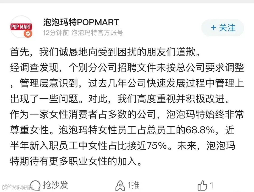 6月4日,泡泡玛特回应称:“首先,我们诚恳地向受到困扰的朋友们道歉。经调查发现,个别分公司招聘文件未按总公司要求调整,管理层意识到,过去几年公司快速发展过程中管理上出现了一些问题。对此,我们高度重视并积极改进。”