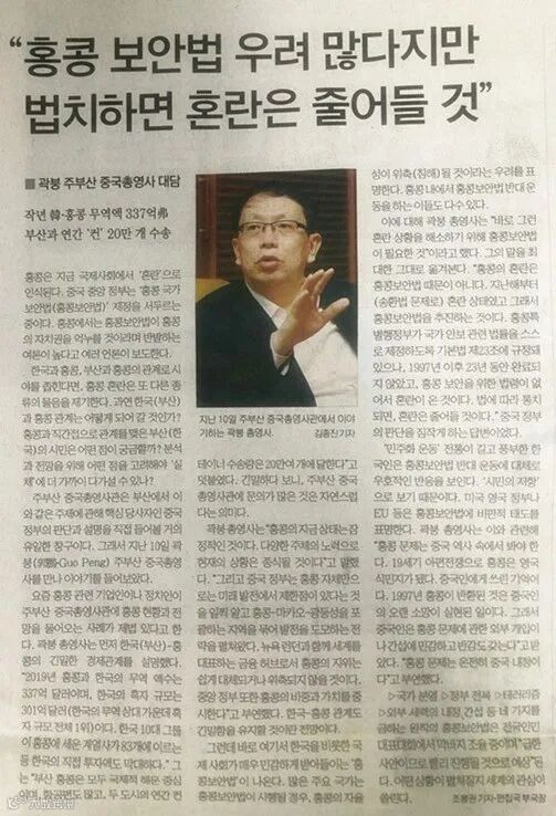 6月10日,郭鹏总领事接受釜山《国际新闻》报社记者专访,就涉港国家安全立法等相关问题回答了记者的提问。