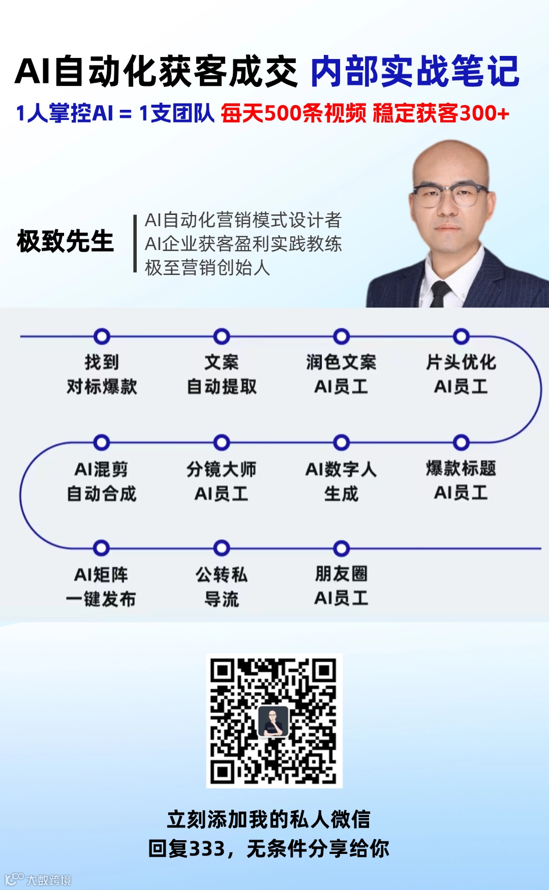 送个礼物给你,扫码添加我的私人微信,回复333,无条件分享《AI自动化获客成交》内部实战笔记,你拿回去就能用。