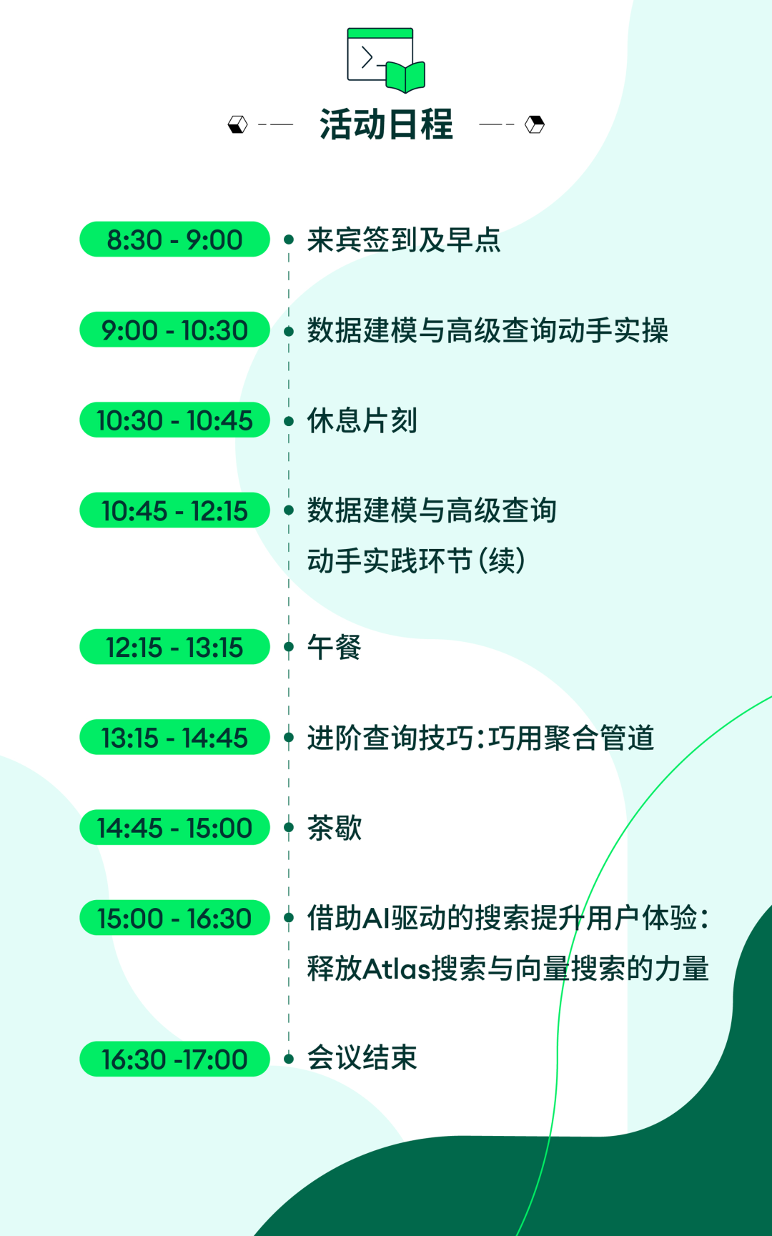 适用的项目阶段:无论是希望优化您的现有应用(特别是当前使用SQL/Oracle的情况)、构建全新的应用、还是审查校验您现有的MongoDB数据模型,您都可以参加模型设计优化专场。尤其特别适合项目早期阶段。