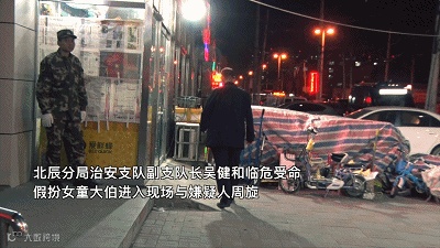 又一次进入烟酒店后,吴健和佯装发怒,拿钱砸向歹徒,暗地里寻找机会。此时,一名女警伪装成被劫持女童的大姨,发疯似的“又哭又闹”。