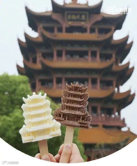游客手拿黄鹤楼网红雪糕在黄鹤楼前留影