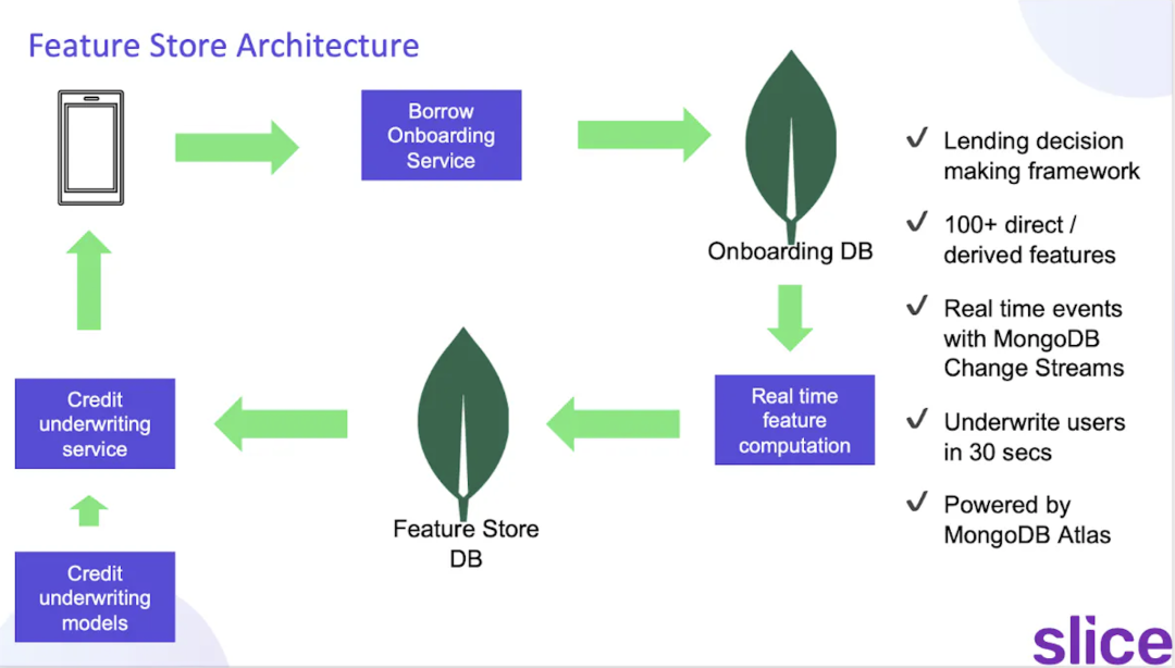 通过在不同的使用案例中使用 MongoDB Atlas(包括作为实时 ML 特征存储),slice 改变了他们的引导流程,将处理时间缩短至不到一分钟。slice 使用具有 MongoDB 和 ML 模型的实时功能存储来即时计算 100 多个变量,从而可以在不到 30 秒的时间内确定信贷资格。