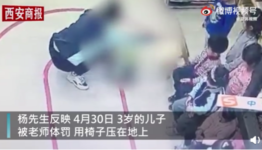 4、幼儿园回应老师用椅子压男童 2日,黑龙江哈尔滨杨先生反映,4月30日,3岁的儿子被老师体罚,用椅子压在地上,儿子不光身体受到伤害,心理也遭遇打击,希望涉事老师被依法处置。2日晚,幼儿园园长表示,老师行为不对,已经对其批评教育,但是否达到量刑标准需官方判定。目前,派出所和教育局已经介入调查。(@漩涡视频)
