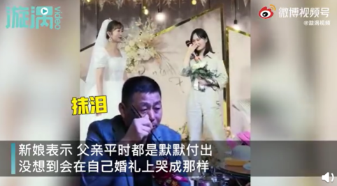 2、女儿结婚父亲埋头吃饭掩饰流泪 1日,陕西渭南一女子在台上举办婚礼,父亲在台下一边吃饭,一边默默流泪。新娘表示,父亲平时都是默默付出,没想到会在自己婚礼上哭成那样。当时父亲用大口大口吃食物来掩饰对自己的不舍,二十多年来第一次看到他哭得这么伤心。(@漩涡视频)