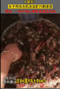 3、女子用洗衣机洗小龙虾结果大翻车 4月30日,贵州遵义一女子参照短视频方法,用洗衣机洗小龙虾。她打开洗衣机盖子后发现,小龙虾全部变成碎渣渣,只剩龙虾壳根本没办法再吃了。女子称,她用洗衣机洗了20分钟,结果小龙虾就成这样了。(@潇湘晨报)
