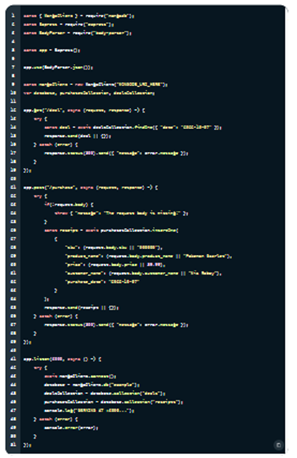在上面的示例中,我们采用了由 Express 框架提供技术支持的 Web 应用程序,其中有两个端点函数。一个端点用于获得交易,另一个端点则用于创建购买。其余内容,请自行想象。