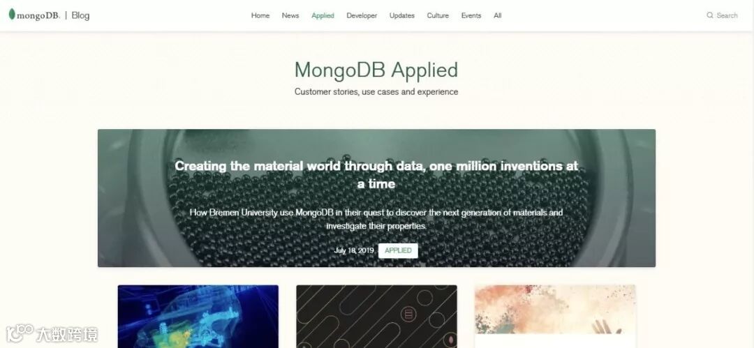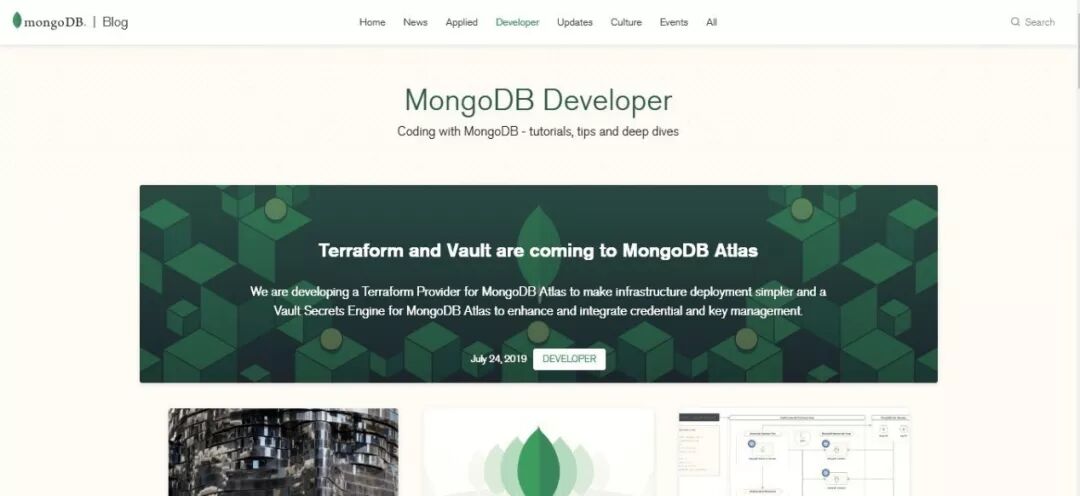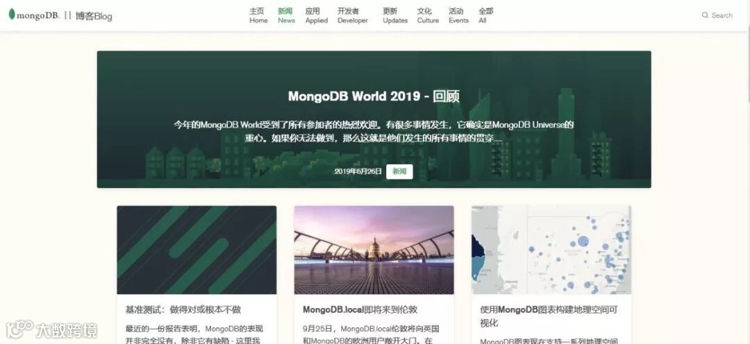 在首页“资源中心”,第一个是独立于其他资源的版块:博客,包括MongoDB新闻、公告、更新、用例、技术文章、活动等丰富内容。在一边进阶的同时,博客就像实践养源不断丰富读者的认知。