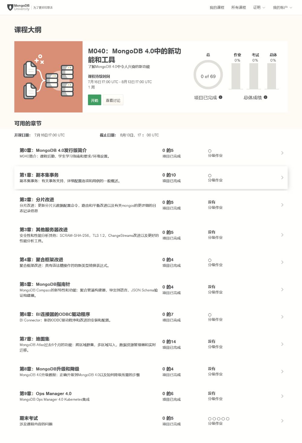 参加课程的方法:注册MongoDB University账号之后,点击进入列表中感兴趣的课程,进入课程详情页查看基础要求、开课时间、讲师、具体章节等信息。