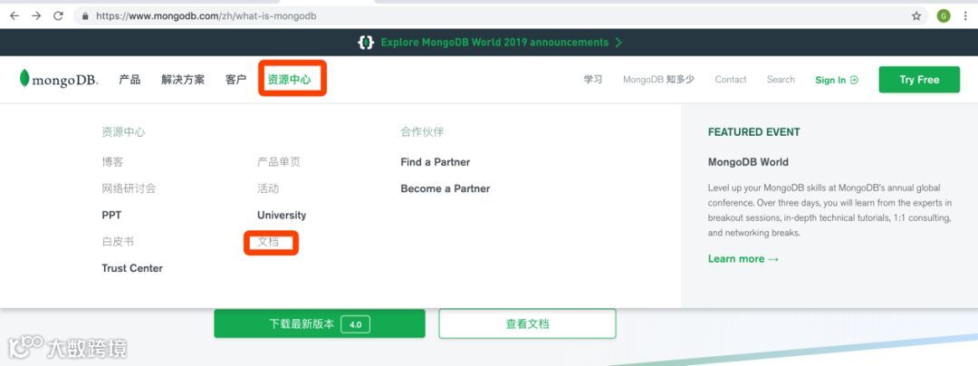 大咖进阶第二步, 进入“资源中心-文档“,这部百科全书有海量的MongoDB产品的说明与示例。
