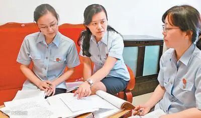 周春梅(左二)和同事一起梳理卷宗、研究案情