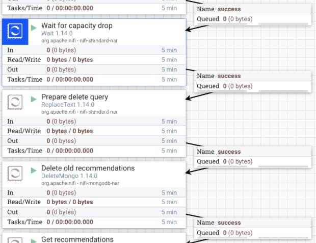 将推荐复制到 MongoDB 便完成了整个工作流。ExecuteSQL 处理器获取和集合每位用户的前 10 项推荐,均以 1,000 行的数据块呈现。接着,以下两个处理器(ConvertAvroToJSON 和 ExecuteScript)备好数据,通过 PutMongoRecord 处理器插入 MongoDB 集合。