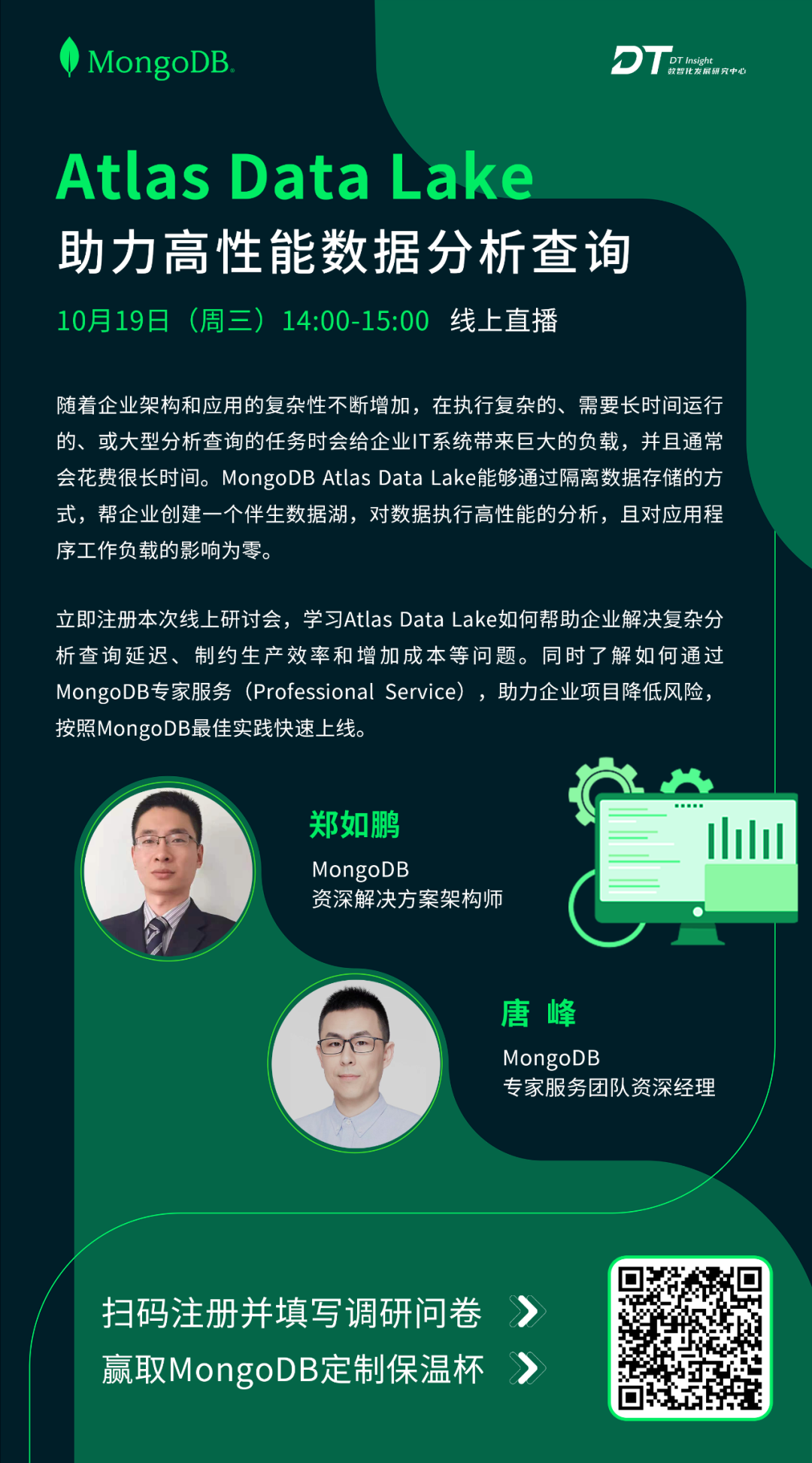 点击阅读原文注册参加本次线上研讨会,学习Atlas如何帮助企业解决复杂分析查询延迟、制约生产效率和增加成本等问题。同时了解如何通过MongoDB专家服务(Professional Service),助力企业项目降低风险,按照MongoDB最佳实践快速上线。