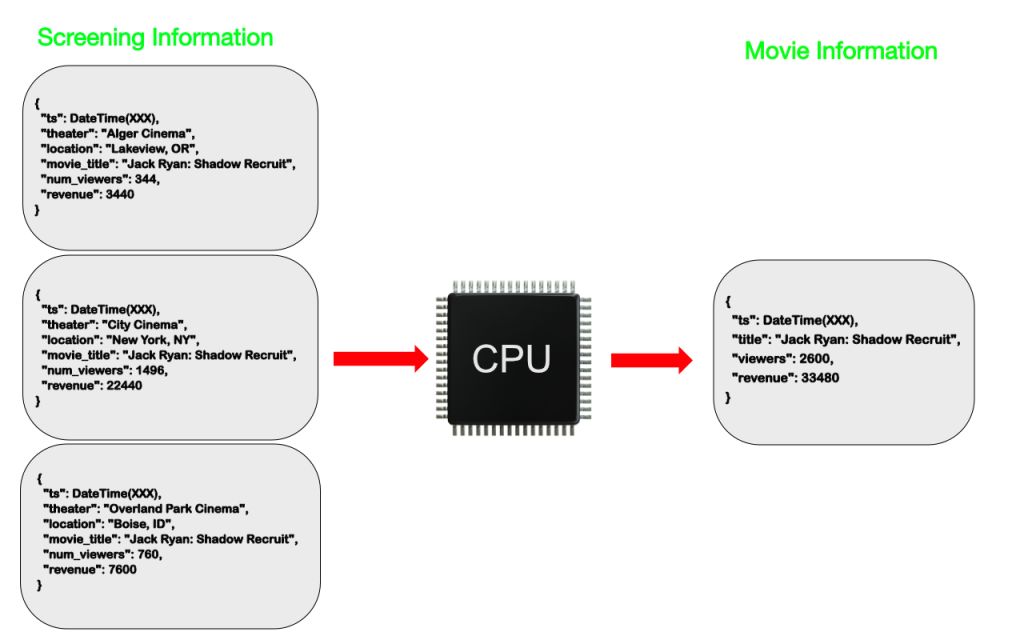在我们的电影数据库示例中,我们可以根据特定电影上的所有放映信息进行计算,并将计算结果与电影本身的信息存储在一起。在低写负载的环境中,这个计算可以与源数据的任意更新一起完成。如果有更多的常规写入,则可以按定义好的时间间隔(例如每小时)进行计算。因为不会对上映信息中的源数据做任何修改,所以我们可以继续运行现有的计算,或者在任何时间点运行新的计算,并且确定将得到正确的结果。