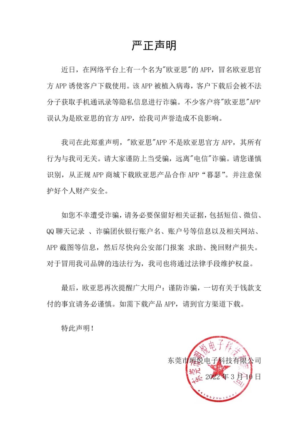 欧亚思提醒广大用户:谨防诈骗,一切有关于钱款支付的事宜请务必谨慎。如需下载产 品APP,请到官方渠道下载。