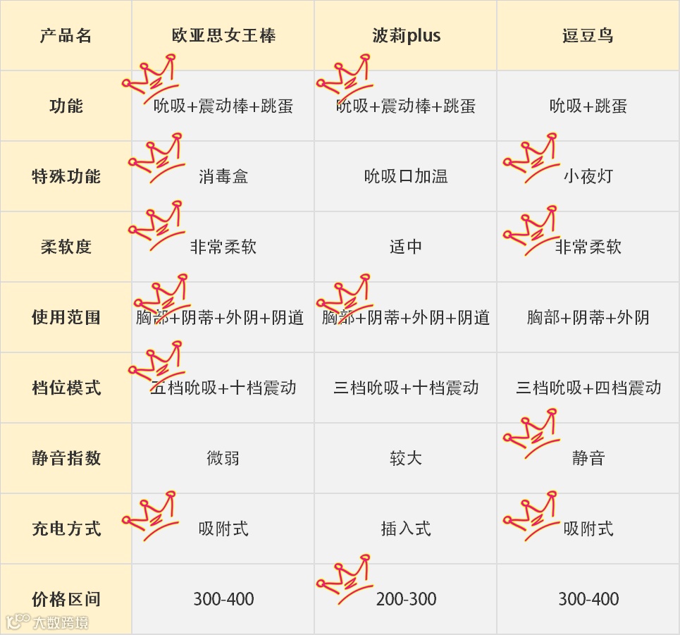 因为「逗豆鸟」和「波莉plus」在吮吸端的档位都是三档,只有「女王棒」是五档吮吸,强度和模式都更加丰富。