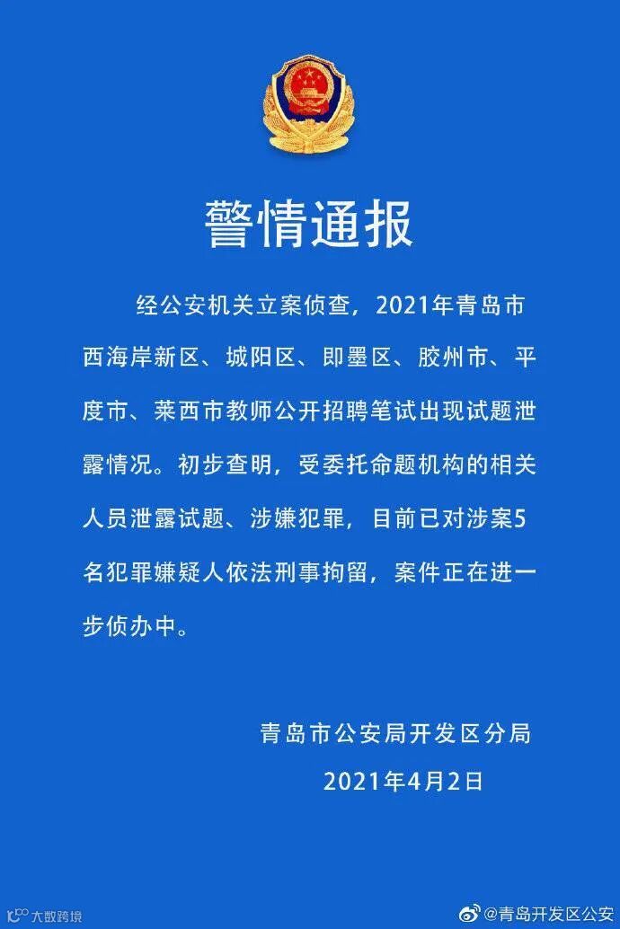 刚刚,青岛市公安局开发区分局发布警情通报:经公安机关立案侦查,2021年青岛市西海岸新区、城阳区、即墨区、胶州市、平度市、莱西市教师公开招聘笔试出现试题泄露情况。初步查明,受委托命题机构的相关人员泄露试题、涉嫌犯罪,目前已对涉案5名犯罪嫌疑人依法刑事拘留,案件正在进一步侦办中。