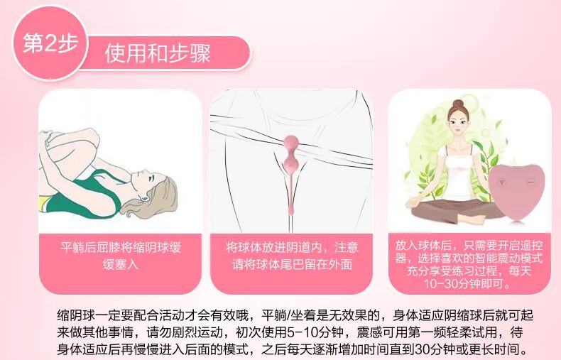 在刚开始使用时,注意涂抹润滑剂在球上,方便进入,在缩-阴-球上涂抹润滑液后,将缩-阴-球放入离阴-道口1~2公分的位置,请将拉绳留在外边,然后就可以随便活动,每次运动30分钟即可。