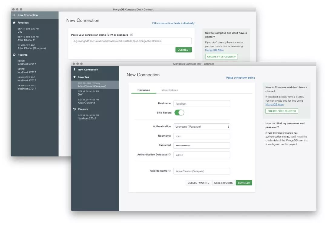 比如,我们对Compass 1.20的连接体验做了全方位的重新设计,使新的连接屏幕更加简洁。你可以在连接字符串中直接进行粘贴,但如需要更先进的连接选项,仍可以单独填写连接细节。