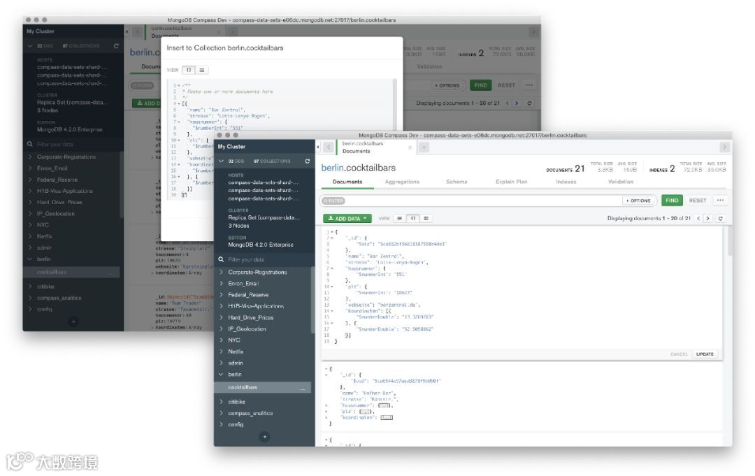 在Compass 1.20中,用户还可以在JSON中直接查看、创建和编辑文档。如果你有原始的JSON对象(例如,对API调用的响应),通过复制粘贴到Compass,可以直接将其作为文档添加进来。